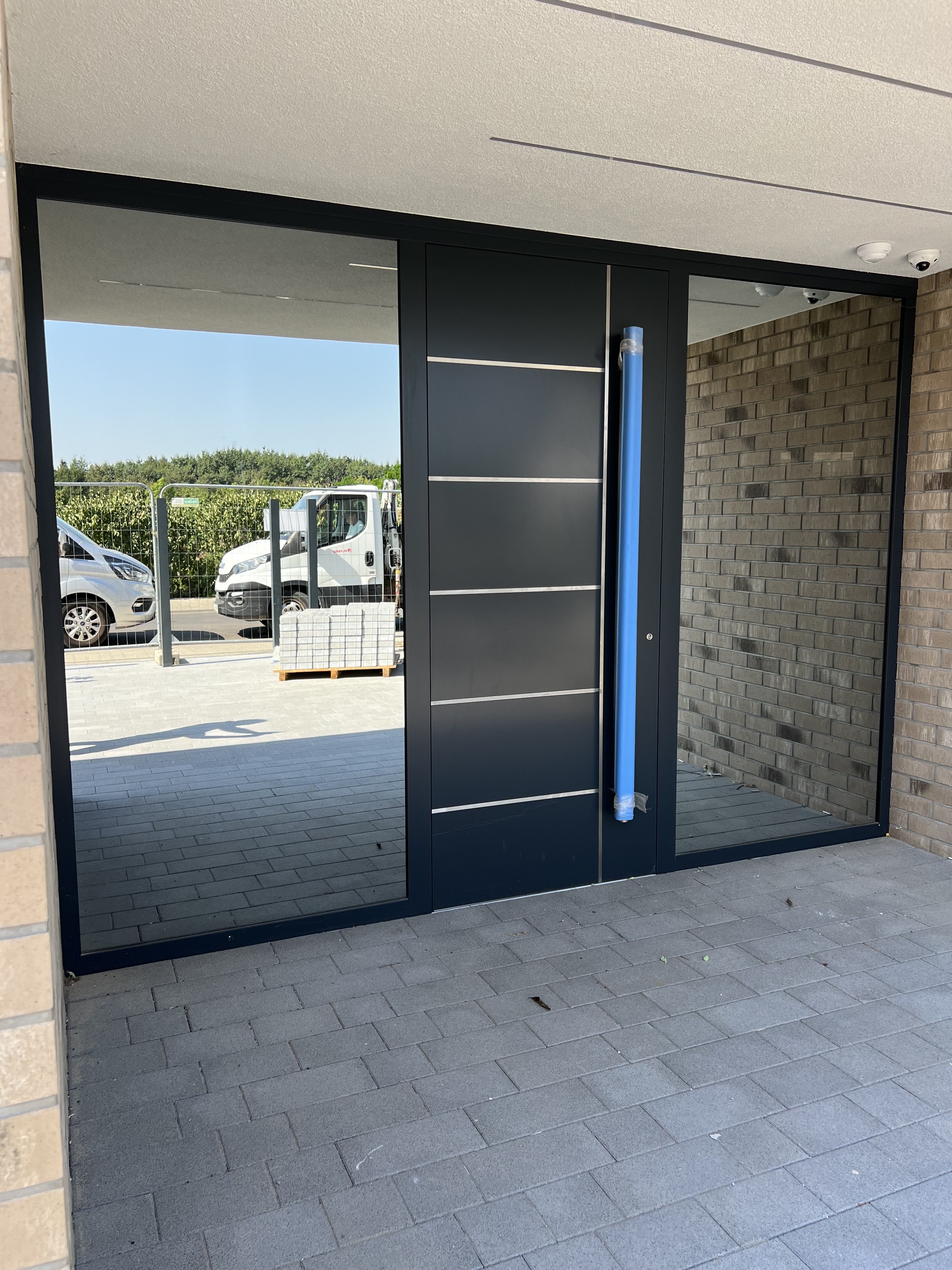 w drzwi wejściowe w systemie Yawal, wzór 2801ST panelowe, zlicowane obustronnie, zlicowana stal nierdzewna, naświetla boczne – lustro Mirastar 1